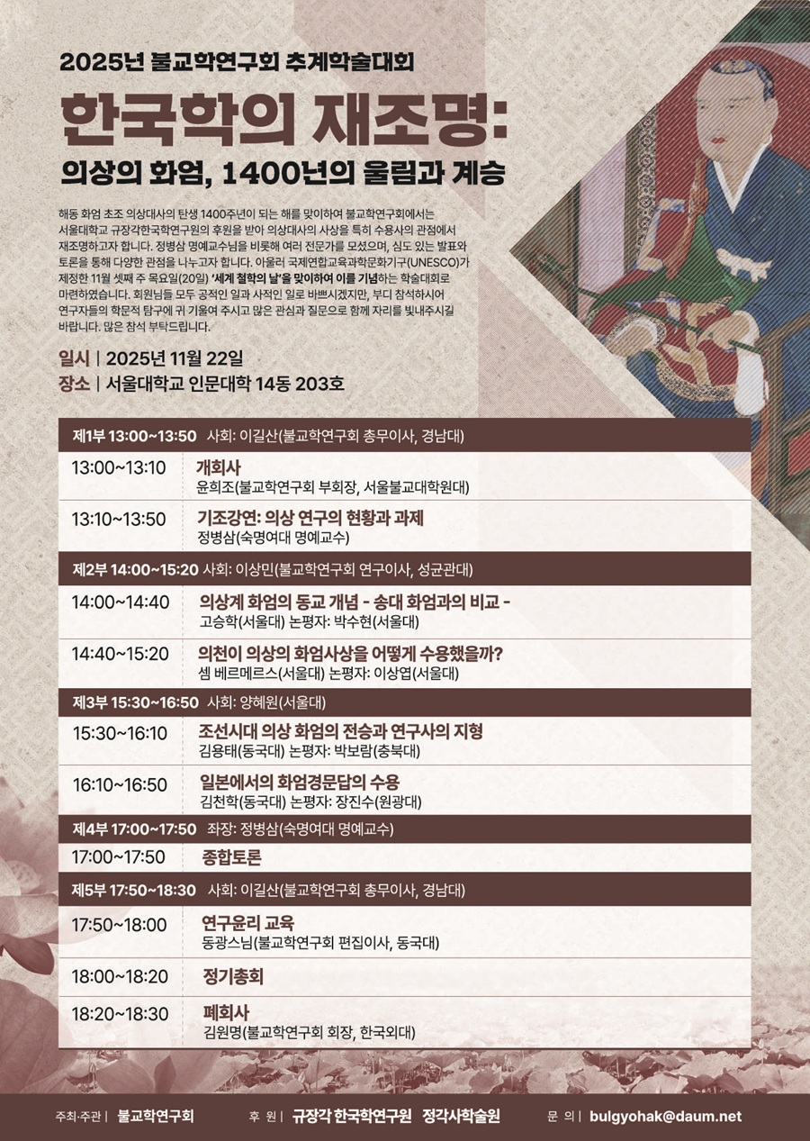 해동 화엄 초조 의상대사의 탄생 1400주년이 되는 해를 맞이하여 불교학연구회에서는 서울대학교 규장각한국학연구원의 후원을 받아 의상대사의 사상을 특히 수용사의 관점에서 재조명하고자 합니다. 정병삼 명예교수님을 비롯해 여러 전문가를 모셨으며, 심도 있는 발표와 토론을 통해 다양한 관점을 나누고자 합니다.
